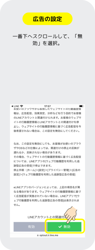詳細を見る>お使いのブラウザから取得するウェブサイトの行動履歴情報とLINEアカウントとの関連付けの停止(オプトアウト)について>LINEアカウントとの関連付けを無効にする
