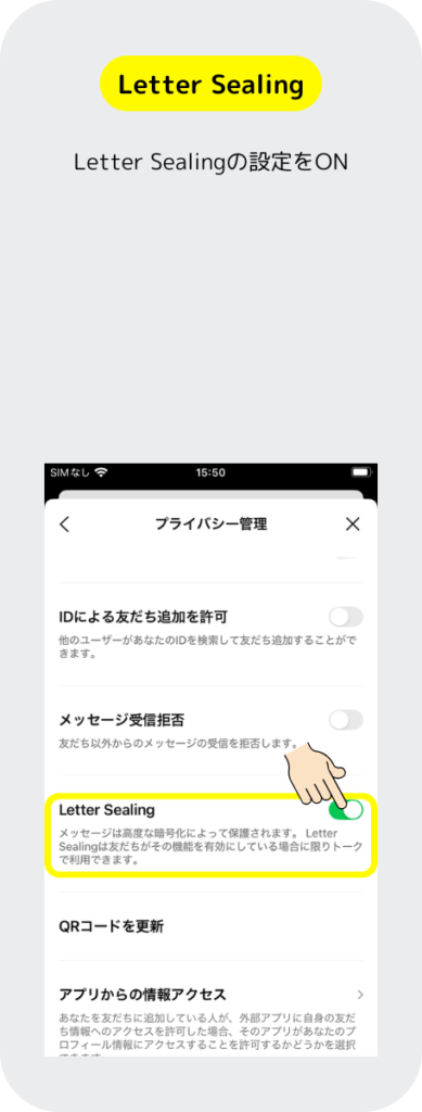 これはメッセージを暗号化する機能のことだよ。初期値はONになっているはずだが確認してね。