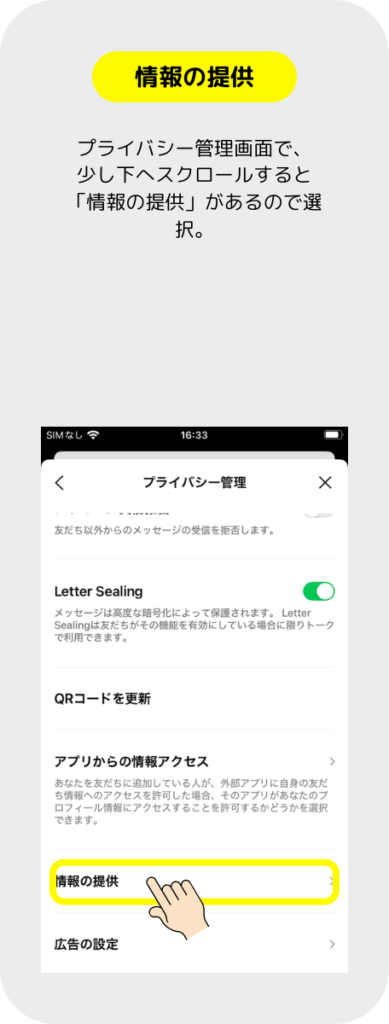 ホーム>設定(右上の歯車のマーク)>プライバシー管理>情報の提供