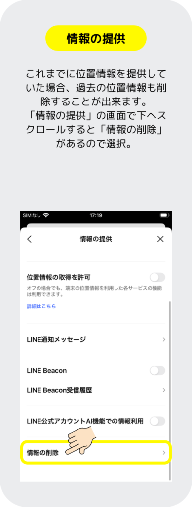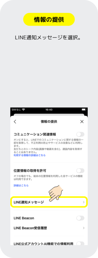 「コミュニケーション関連情報」、「位置情報の取得の許可」、「LINE beacon」、「LINE通知メッセージ」
