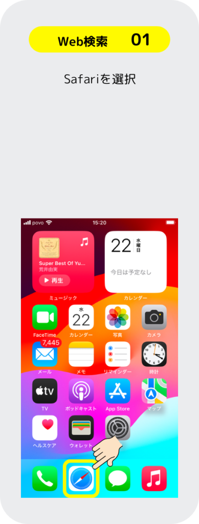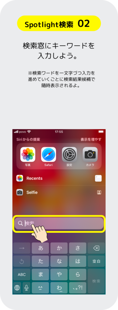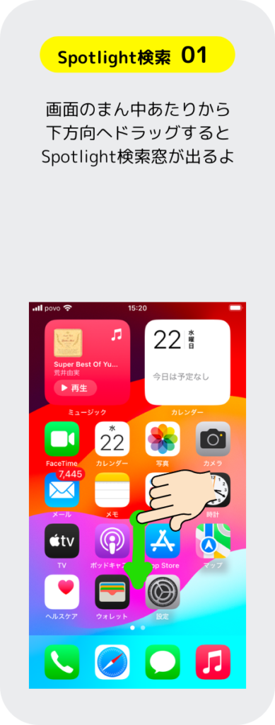 iPhoneではホーム画面のまん中あたりから下へスワイプすることで検索窓が表示される。この検索窓にキーワードを入力して検索をする手順を「Spotlight検索」と言うよ。この検索手順ではインターネットWeb検索も含めて、スマホ内に登録している連絡先や、メール、アプリ、設定、デバイス内のファイル、フォルダなどの検索できるものは全て検索するという機能です。前項のSafariを開いて検索するよりも、素早く検索できるので便利なのでちょっとだけ説明しておくね。