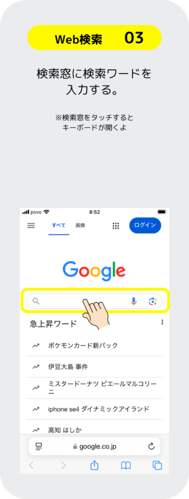 検索エンジンとはインターネット上に存在している様々な情報からWebページや画像、動画などを見つけ出して表示するシステムのことを言うよ。検索窓には関連すると思うキーワードを入力してね。すると、関連性の高い情報を一覧で表示してくれるよ。
