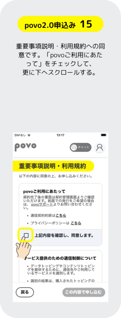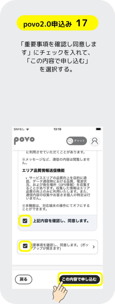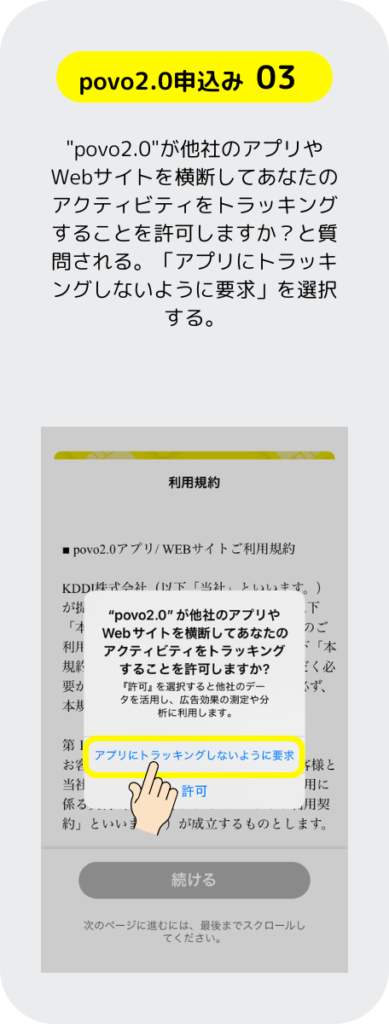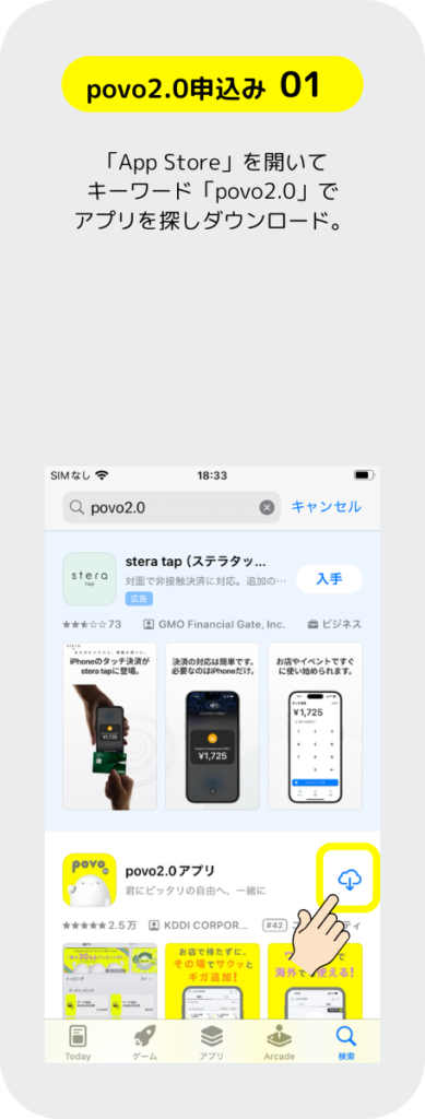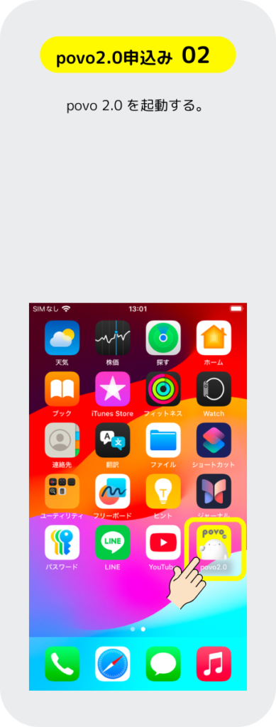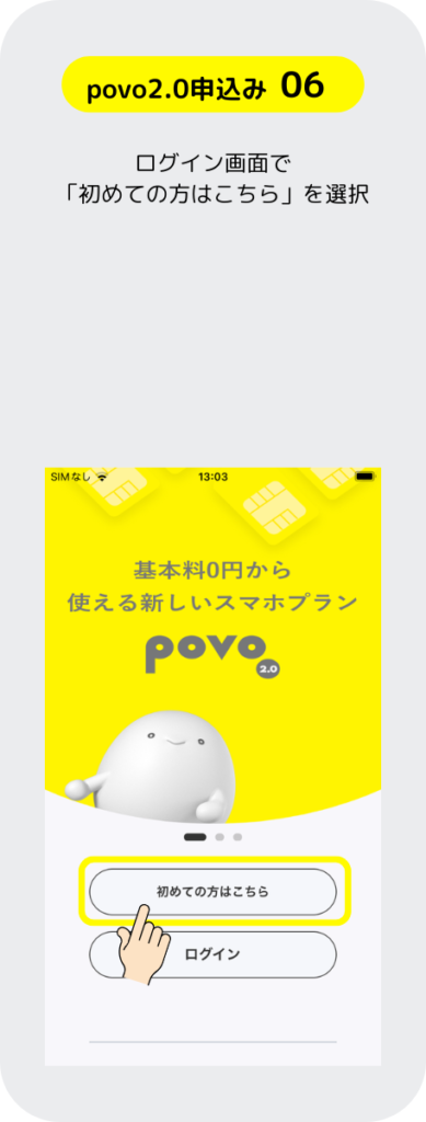 povo 2.0 の申し込みするには先にスマホにアプリをインストールして、そのアプリからSIMの申し込みをする手順となっているぞ。もちろん、パソコンのブラウザでも申し込み出来るが運転免許証等の本人確認書類を提出する手順のところがスマホ操作の方が簡単だ。