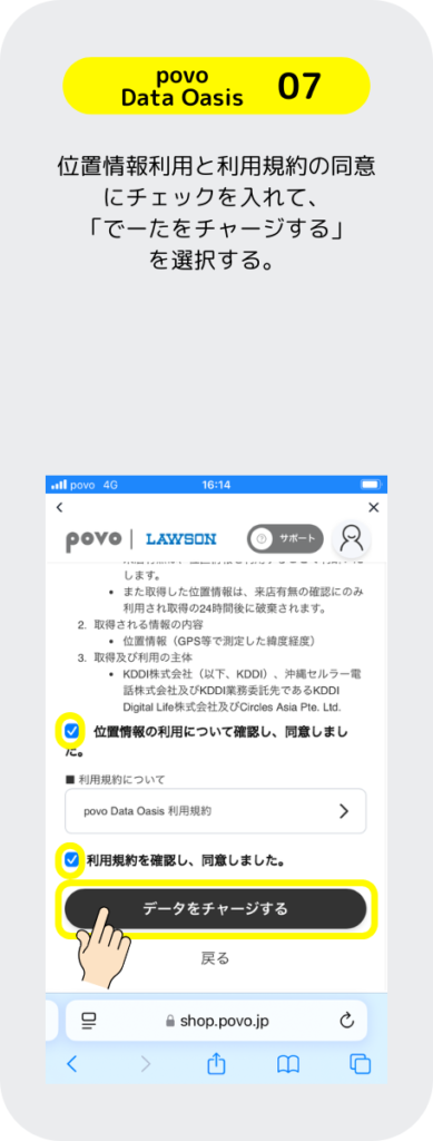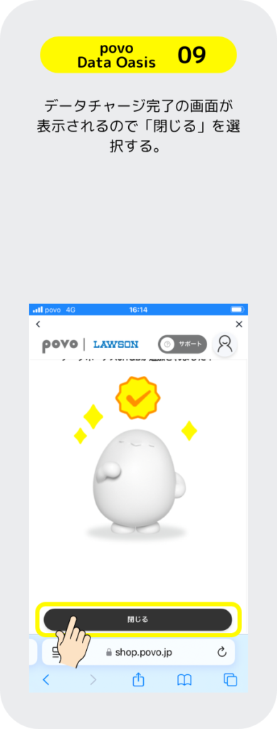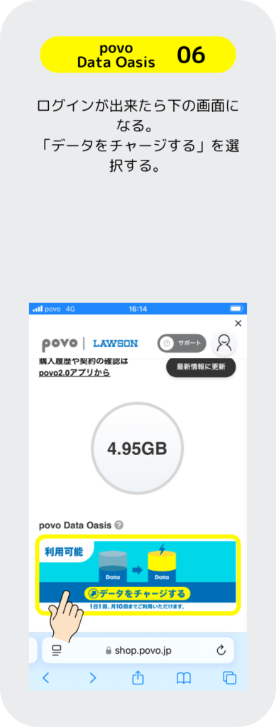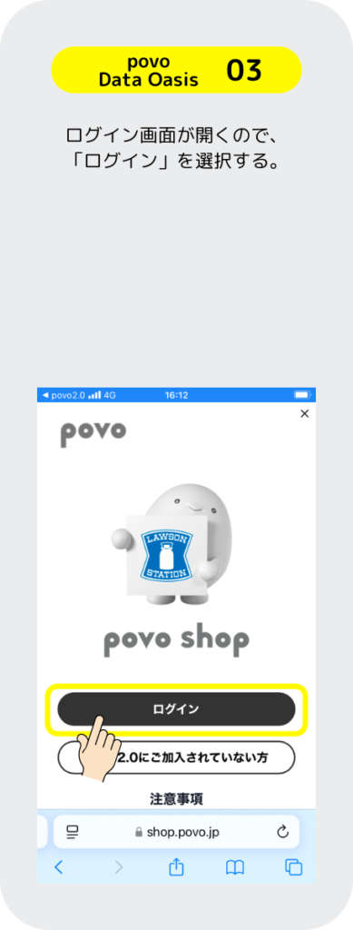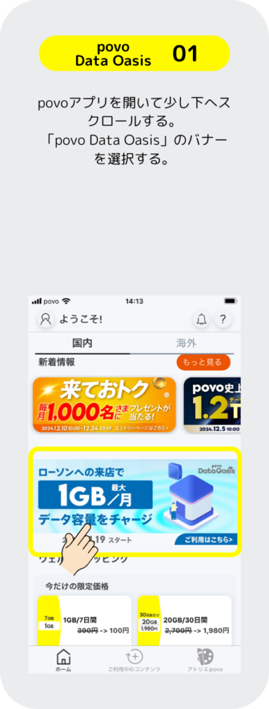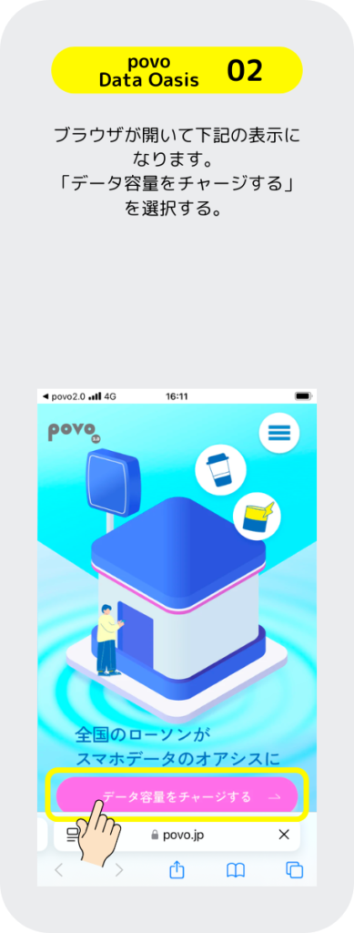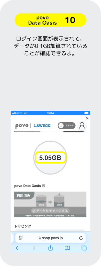 povoはローソンに行くと良いことがあるぞ。「povo Data Oasis」と言うサービスは、ローソンに行くだけで 0.1GBのギガを無料でもらえるぞ。その他にも、お買い物とギガがセットになったトッピングがあるのでローソンが近くにある人はお得なのだ。